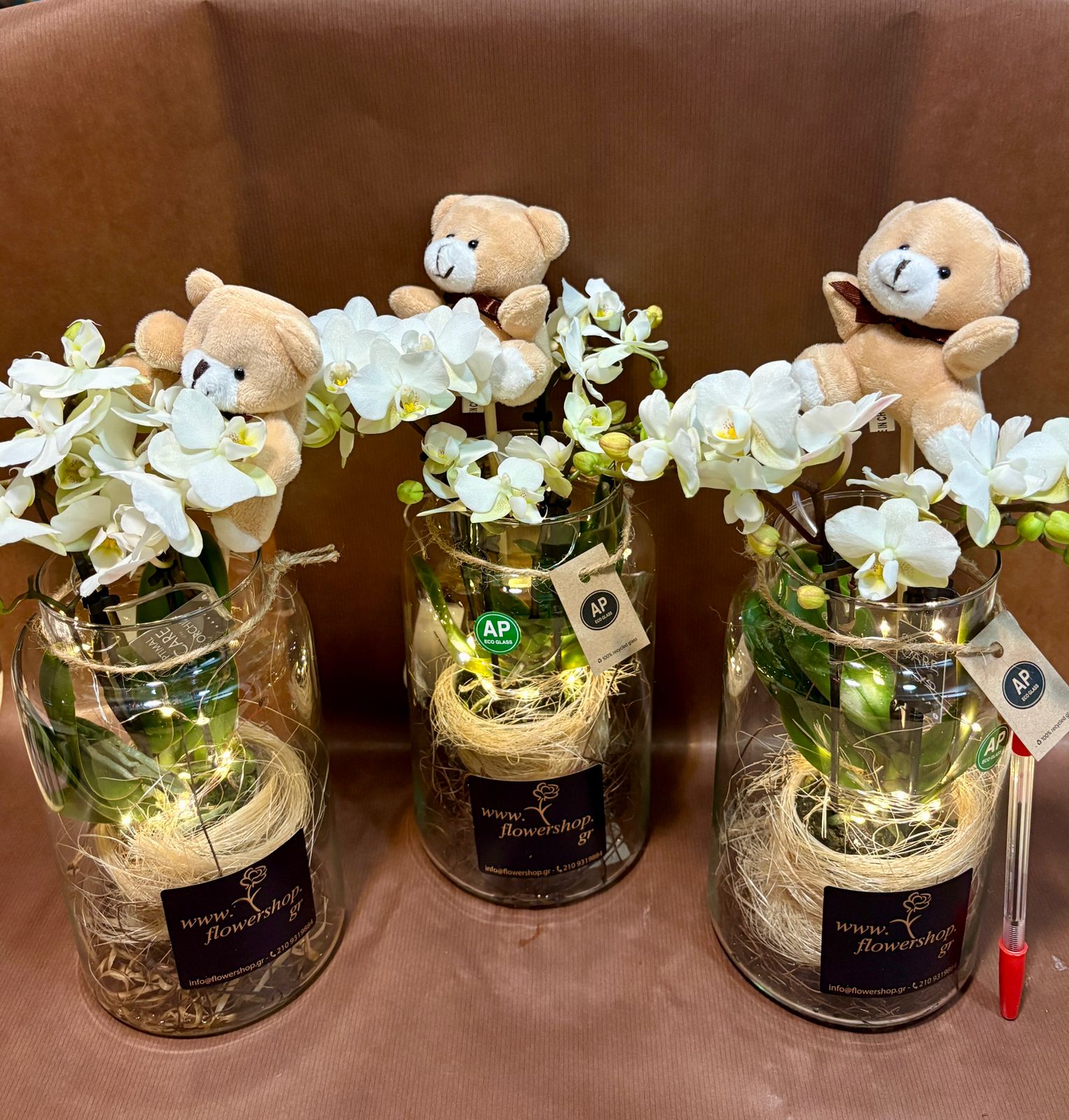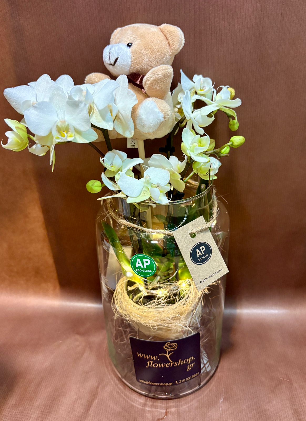 Ορχιδέα Μίνι Βαλεντίνου σε γυάλινο βάζο με διακόσμηση, αρκουδάκι & leds. Φυτό Αγάπης!!! (1) τεμάχιο