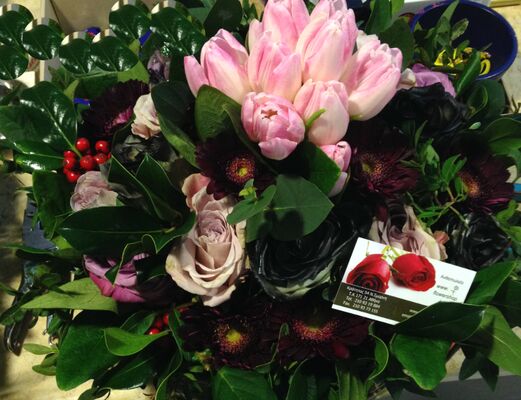 Exceptionally impressive roses with all "rainbow" colors on their pedals with other season flowers and greens. Delivery only in Attica area of Greece.
